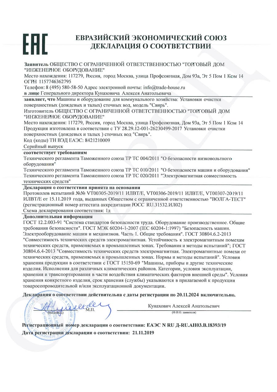 "СВИРЬ" - современная установка очистки стоков талых и ливневых вод. Область применения оборудования – жилой сектор, автозаправки, промышленные объекты и пр. Система выполняет комплексную фильтрацию от разных загрязнений.