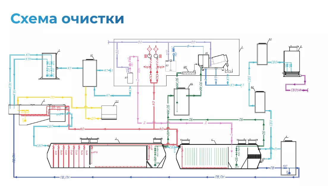 - Биологическая очистка с процессами нитрификации-денитрификации.